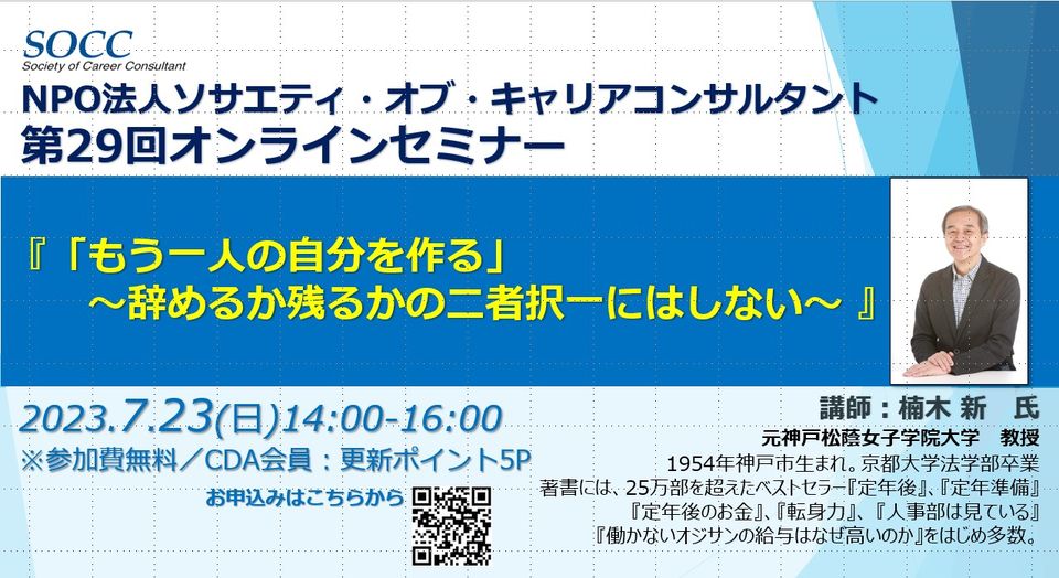 25万部を超えたベストセラー 『定年後』著作者の楠木 新 氏にご登壇いただき『もう一人の自分を作る」 ~辞めるか残るかの二者択一にはしない~』と題して開催しました。45歳以降の人生後半戦を概観したうえで、長い定年後の期間を 充実して過ごすために現役時代にどの様な対応が個人や組織に求められるかを皆さんと一緒に考えます。 その際に、統計やキャリア理論というよりも実際に組織で働いている人の数多くの取材をベースにお話いただきます。