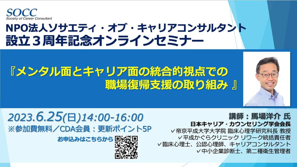 職場復帰後の再休職を防ぐために、「一人一人の働き方に向き合う支援」を目標にして、「本人・企業・医療機関の密な連携」を大事にしているリワークプログラムの実践例をもとにして、職場復帰におけるメンタル面とキャリア面を統合した支援を紹介いただきます。