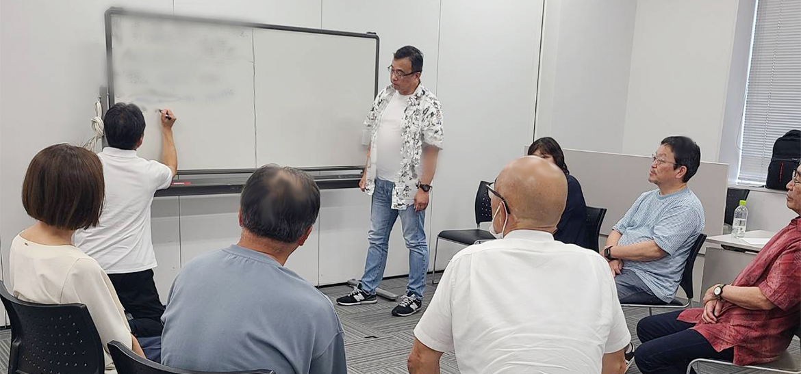 2024-09-24 【活動事例】ピカジップ(PCAGIP)を体験! ホワイトボードを囲んで円陣になって、 「金魚」と呼ばれる参加者が順に1人1つの質問をし、それに事例提供者が答えていきます。そしてファシリテーターは安心な場づくり……